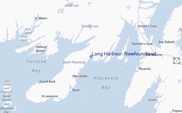 Other Nearby Locations' tide tables and tide charts to Long Harbour, Newfoundland: