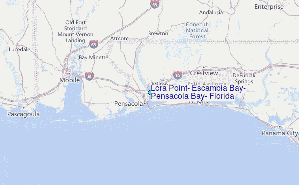 Use this relief map to navigate to tide stations, surf breaks and cities that are in the area of Lora Point, Escambia Bay, Pensacola Bay, Florida.
