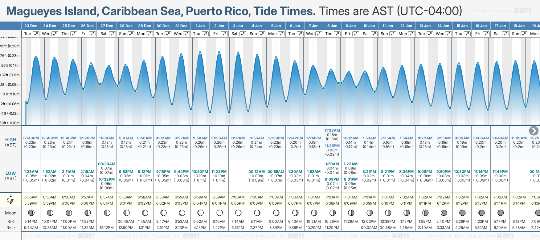December and January Tide charts for Magueyes Island, Caribbean Sea: The tide charts below show the height, time and date of high and low tides for the next 30 days.