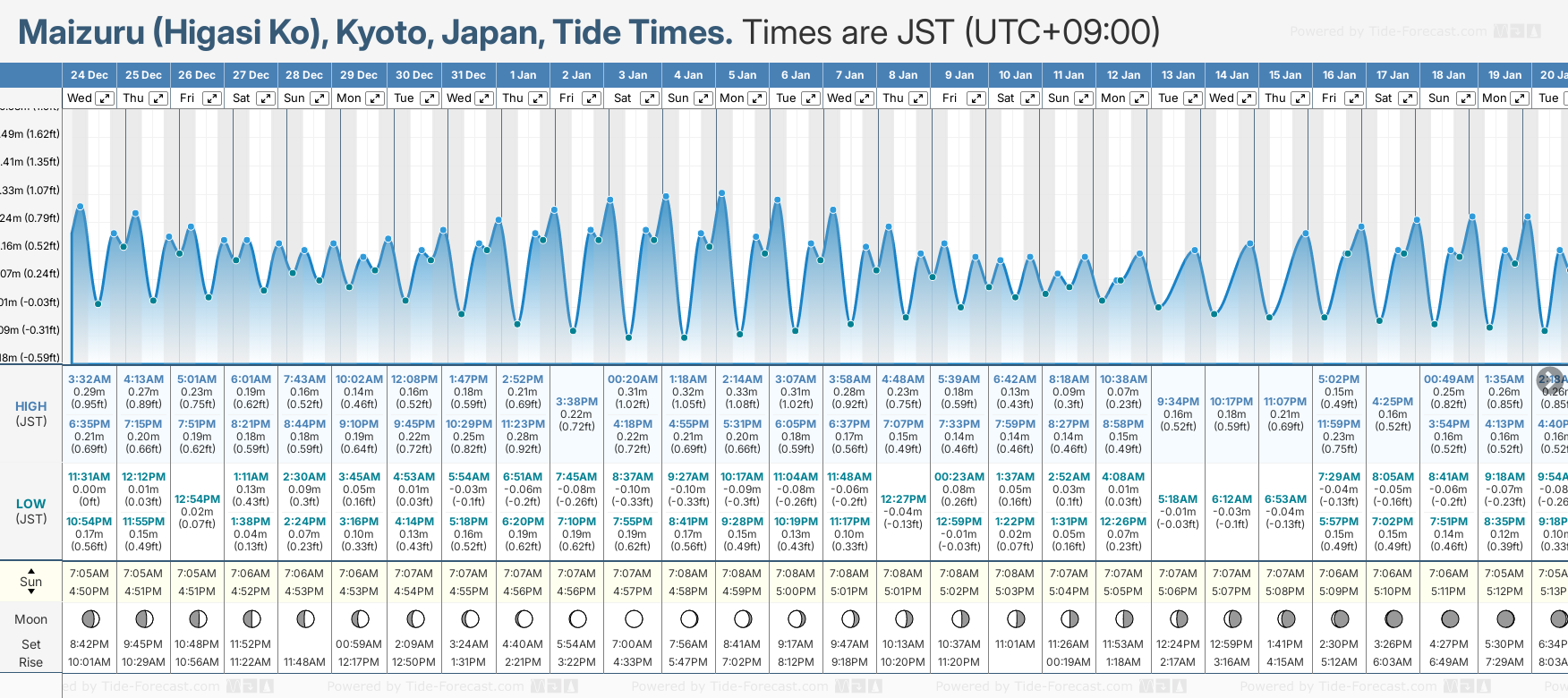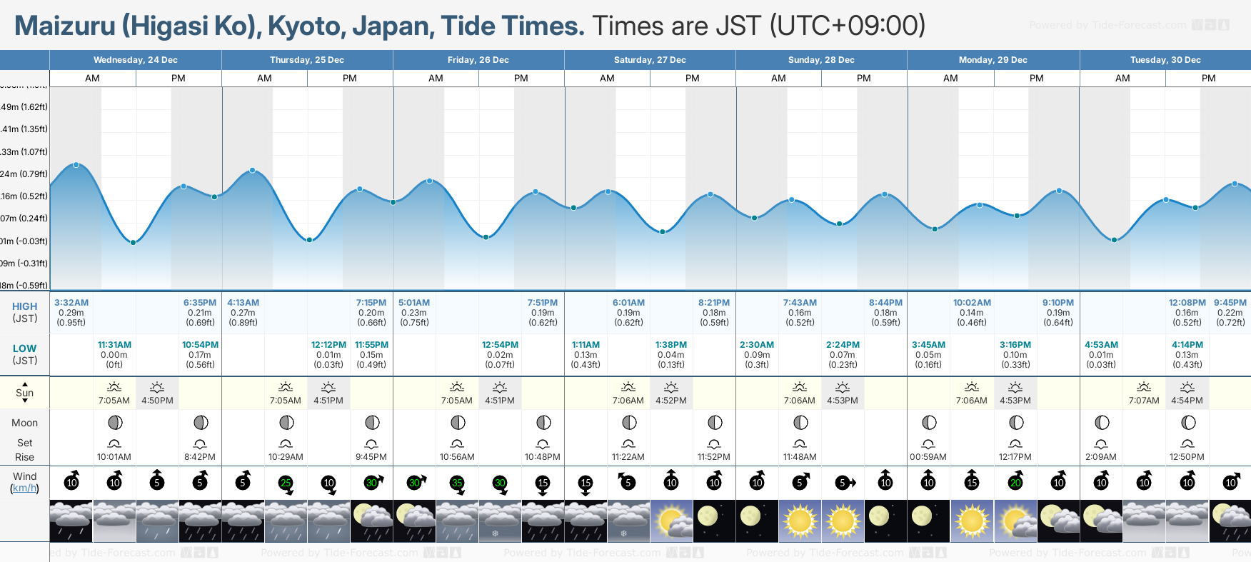 December and January Tide charts for Maizuru (Higasi Ko): The tide charts below show the height, time and date of high and low tides for the next 30 days.
