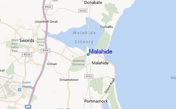 Use this relief map to navigate to tide stations, surf breaks and cities that are in the area of Malahide.