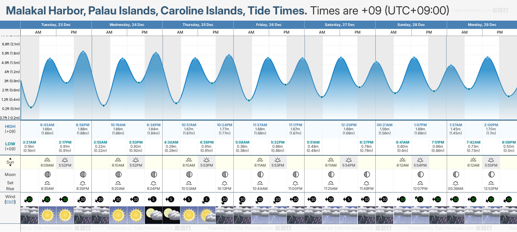 Tide Times are +09 (UTC +9.0hrs). Last Spring High Tide at Malakal Harbor was on Tue 23 Dec (height: 1.89m 6.2ft). Next high Spring Tide at Malakal Harbor will be on Mon 05 Jan (height: 2.00m 6.6ft).