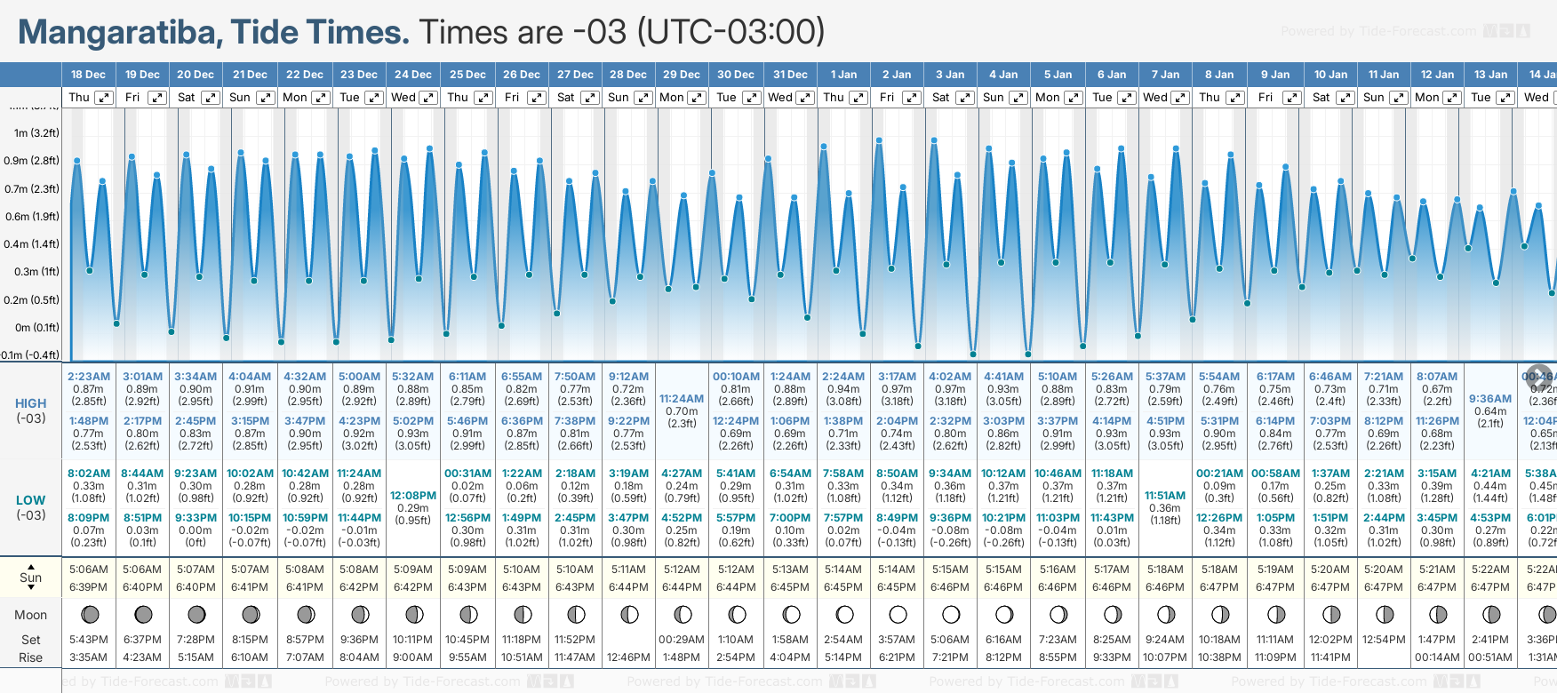 December and January Tide charts for Mangaratiba: The tide charts below show the height, time and date of high and low tides for the next 30 days.