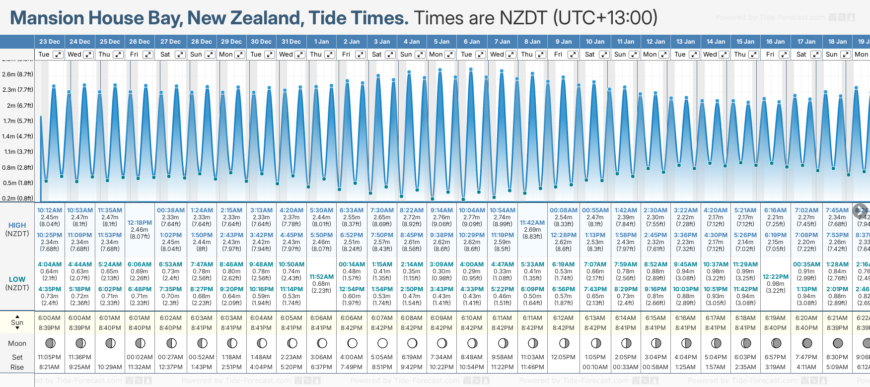 December and January Tide charts for Mansion House Bay: The tide charts below show the height, time and date of high and low tides for the next 30 days.