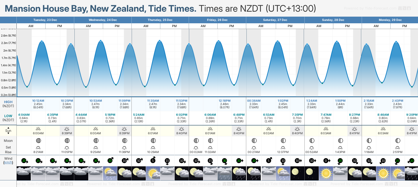 Tide chart for Mansion House BayShowing low and high tide times for the next 30 days at Mansion House Bay. Tide Times are NZDT (UTC +13.0hrs).