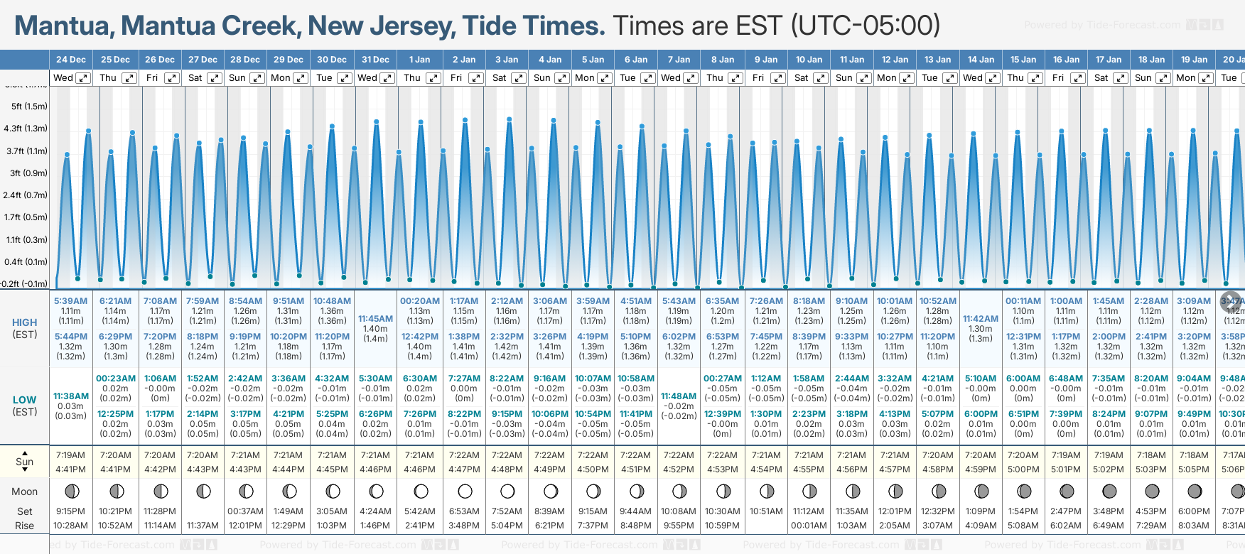 Tide Times are EST (UTC -5.0hrs). Last Spring High Tide at Mantua, Mantua Creek was on Fri 19 Dec (height: 1.36m 4.5ft). Next high Spring Tide at Mantua, Mantua Creek will be on Sat 03 Jan (height: 1.42m 4.7ft).