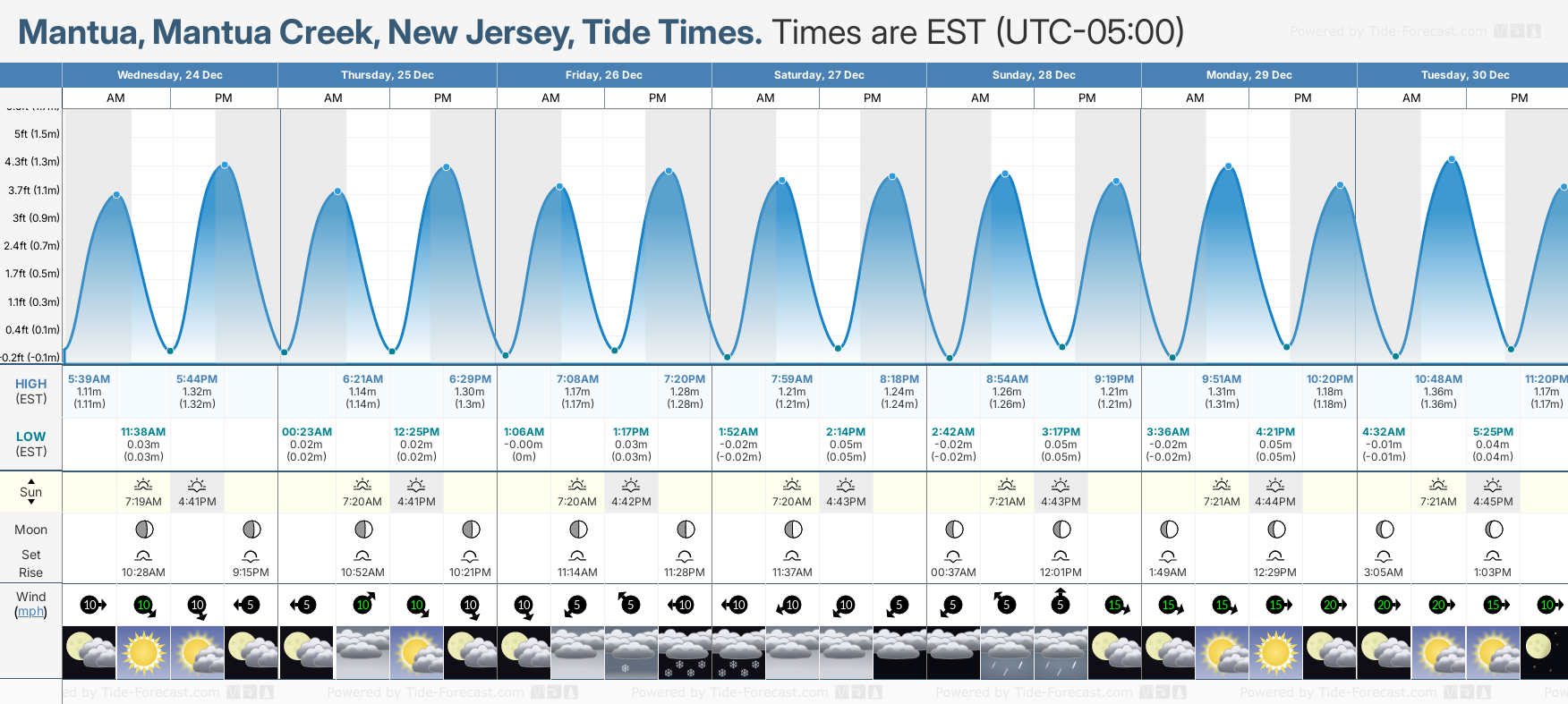 Tide chart for Mantua, Mantua CreekShowing low and high tide times for the next 30 days at Mantua, Mantua Creek. Tide Times are EST (UTC -5.0hrs).