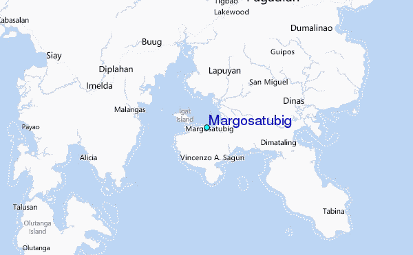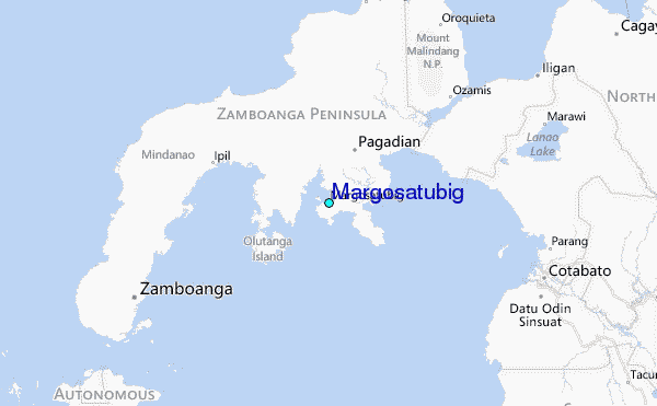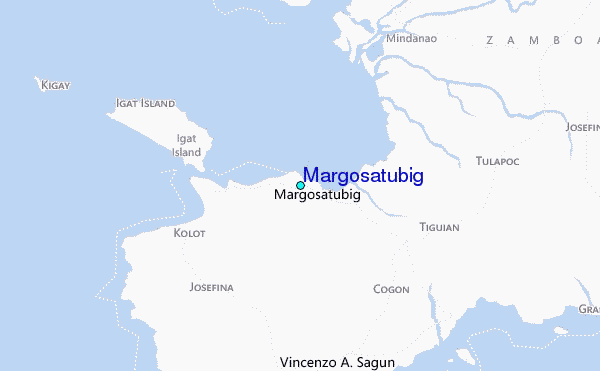 Use this relief map to navigate to tide stations, surf breaks and cities that are in the area of Margosatubig.