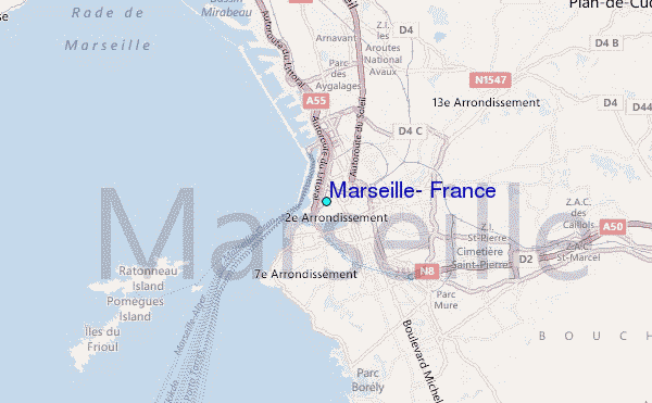 Use this relief map to navigate to tide stations, surf breaks and cities that are in the area of Marseille, France.