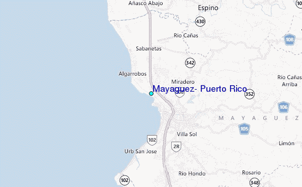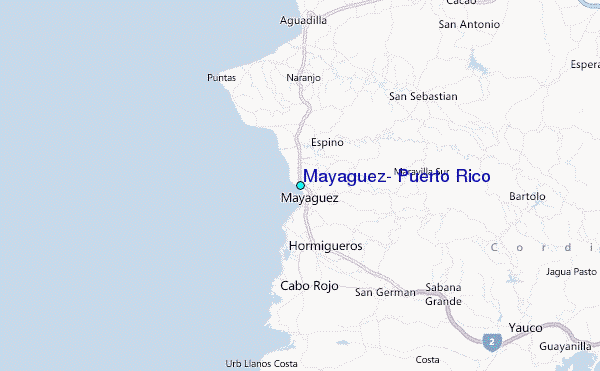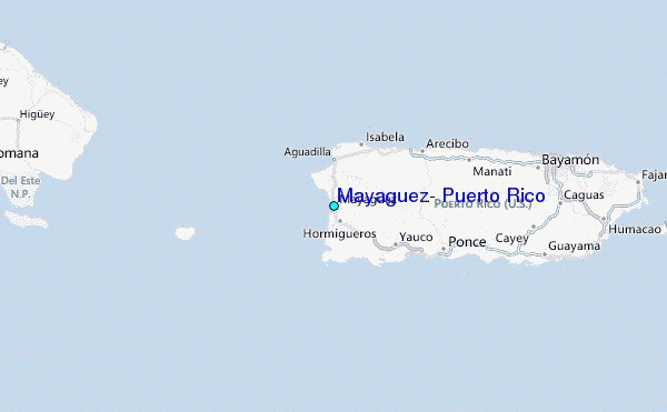 Use this relief map to navigate to tide stations, surf breaks and cities that are in the area of Mayaguez, Puerto Rico.