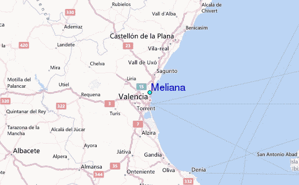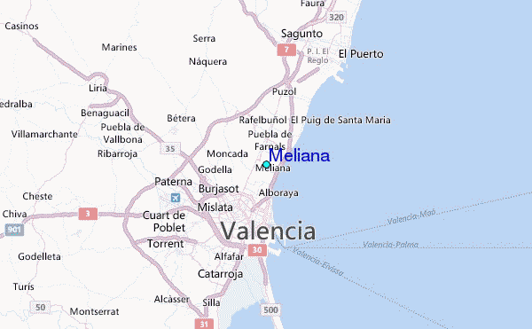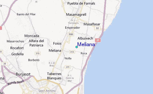 Use this relief map to navigate to tide stations, surf breaks and cities that are in the area of Meliana.