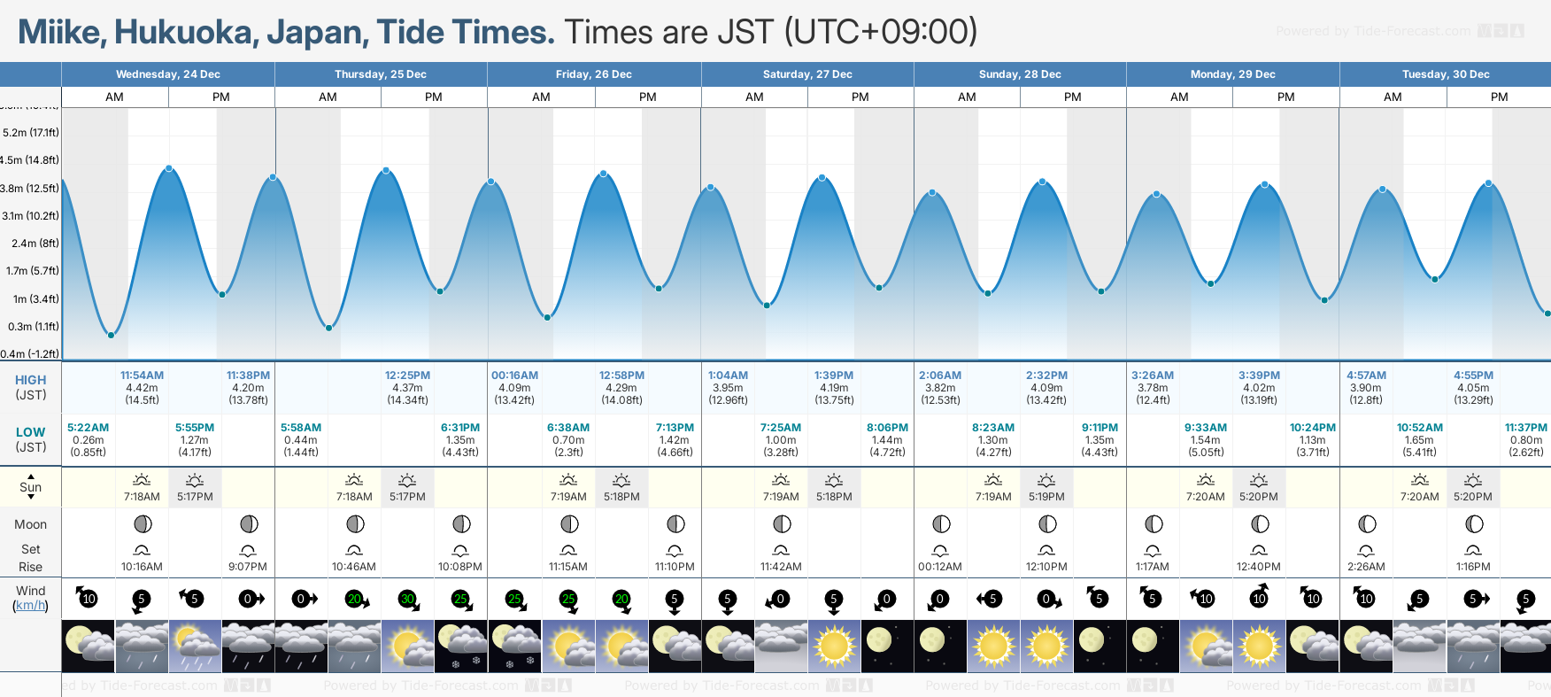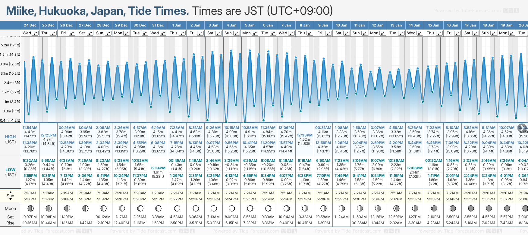 Tide Times are JST (UTC +9.0hrs). Last Spring High Tide at Miike was on Mon 22 Dec (height: 4.46m 14.6ft). Next high Spring Tide at Miike will be on Mon 05 Jan (height: 4.91m 16.1ft).