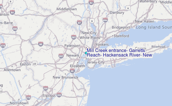 Use this relief map to navigate to tide stations, surf breaks and cities that are in the area of Mill Creek entrance, Garretts Reach, Hackensack River, New Jersey.