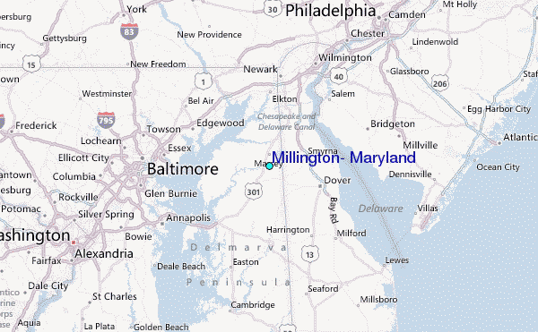 Use this relief map to navigate to tide stations, surf breaks and cities that are in the area of Millington, Maryland.