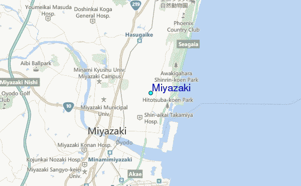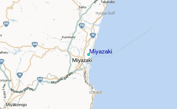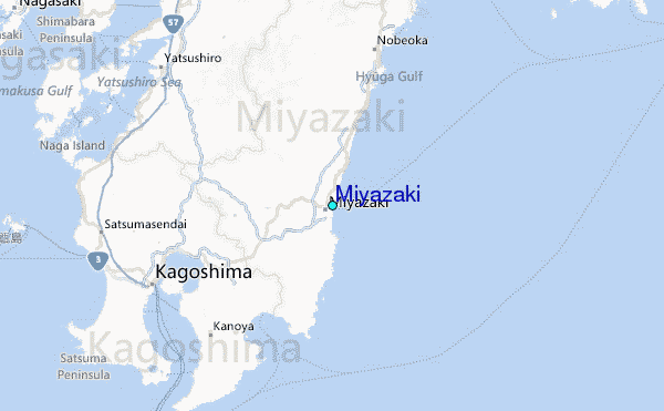 Use this relief map to navigate to tide stations, surf breaks and cities that are in the area of Miyazaki.