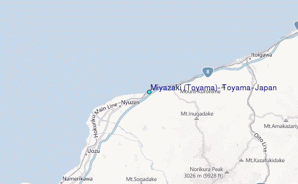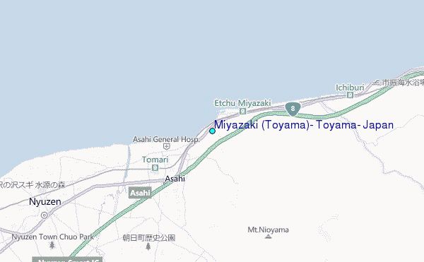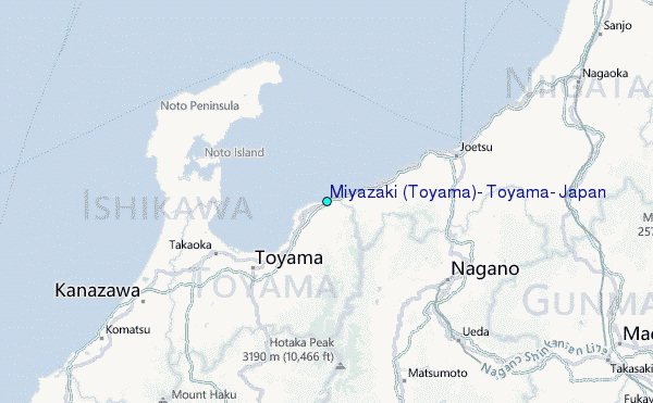 Use this relief map to navigate to tide stations, surf breaks and cities that are in the area of Miyazaki (Toyama), Toyama, Japan.