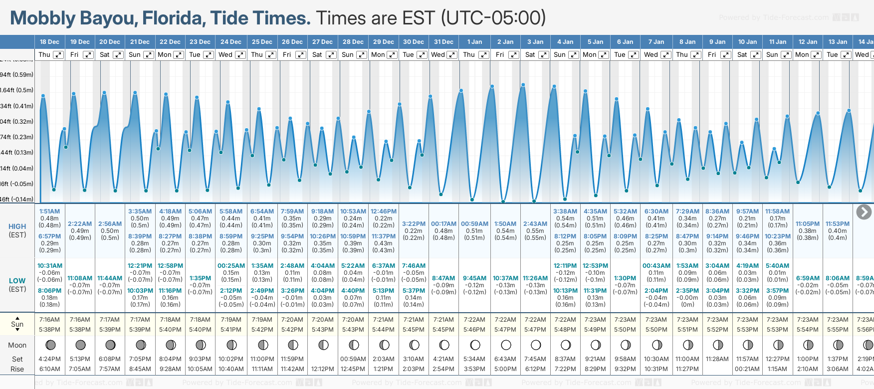 December and January Tide charts for Mobbly Bayou: The tide charts below show the height, time and date of high and low tides for the next 30 days.