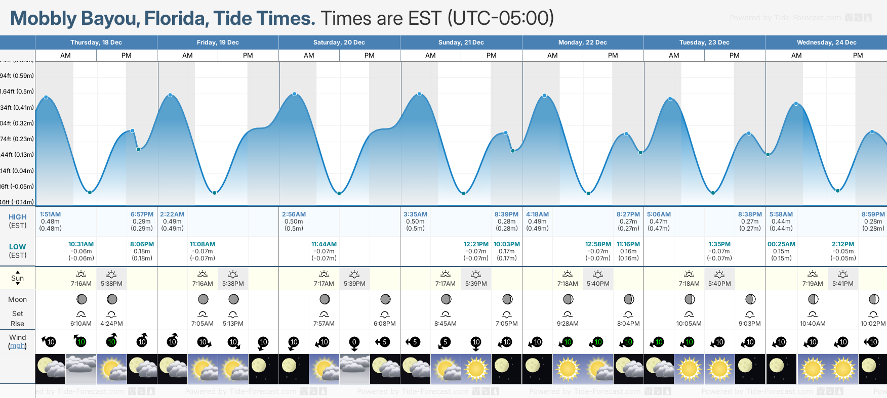 Tide Times are EST (UTC -5.0hrs). Last Spring High Tide at Mobbly Bayou was on Fri 05 Dec (height: 0.61m 2.0ft). Next high Spring Tide at Mobbly Bayou will be on Fri 19 Dec (height: 0.50m 1.6ft).