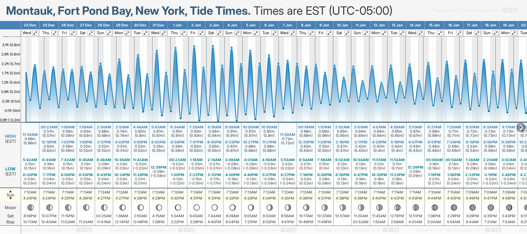 December and January Tide charts for Montauk, Fort Pond Bay: The tide charts below show the height, time and date of high and low tides for the next 30 days.