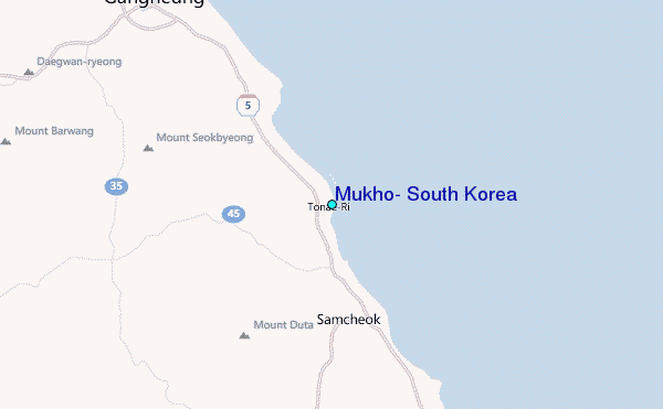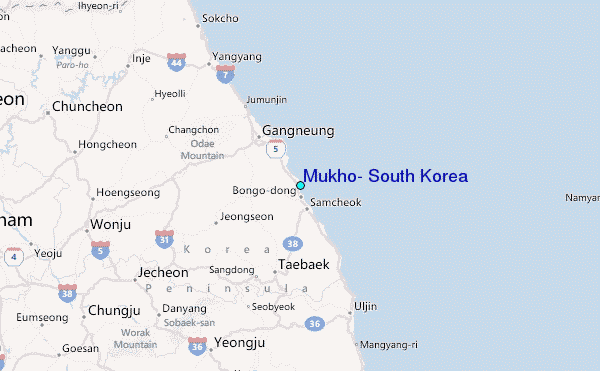Use this relief map to navigate to tide stations, surf breaks and cities that are in the area of Mukho, South Korea.