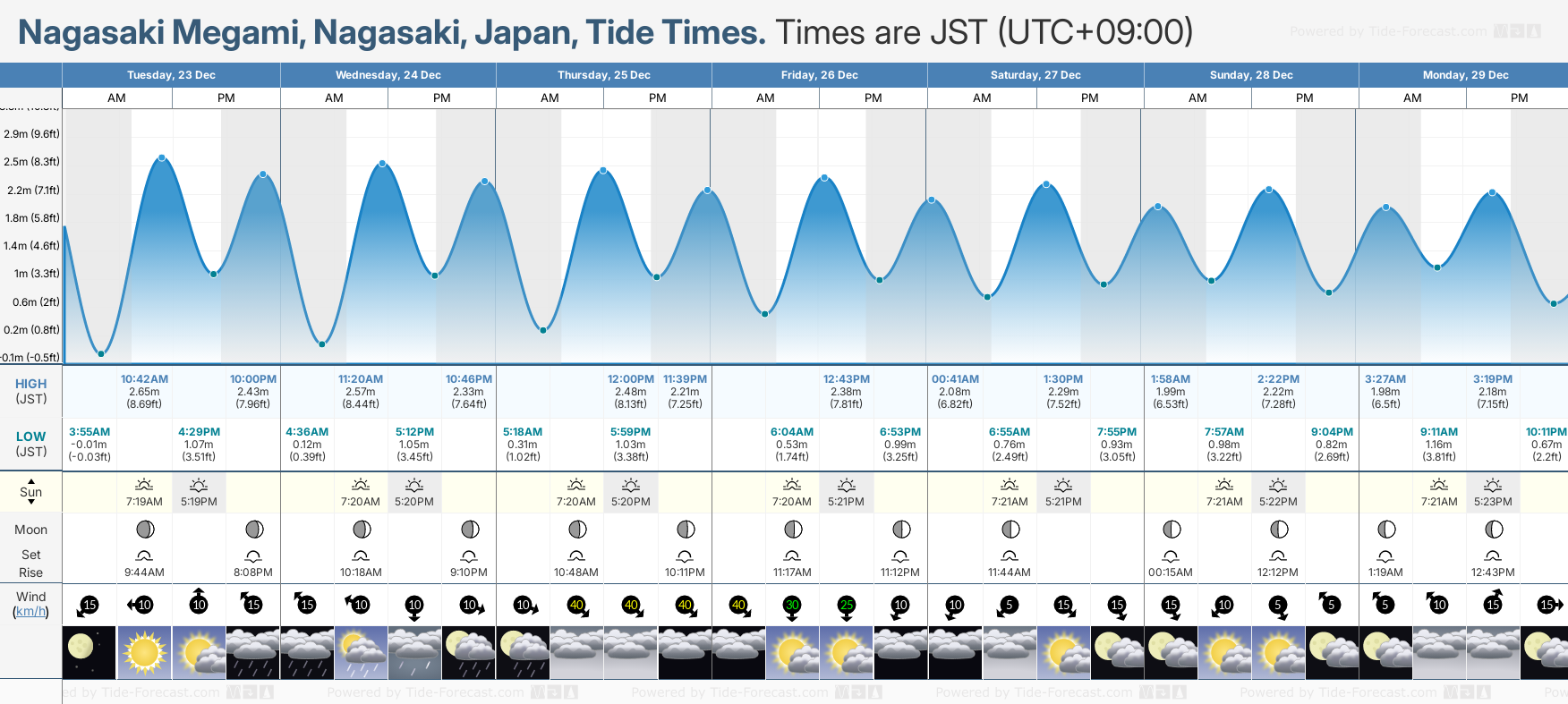 December and January Tide charts for Nagasaki: The tide charts below show the height, time and date of high and low tides for the next 30 days.