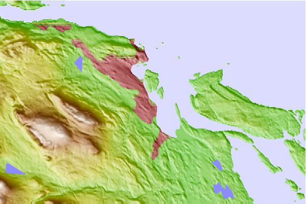 Use this relief map to navigate to tide stations, surf breaks and cities that are in the area of Nanaimo, British Columbia.