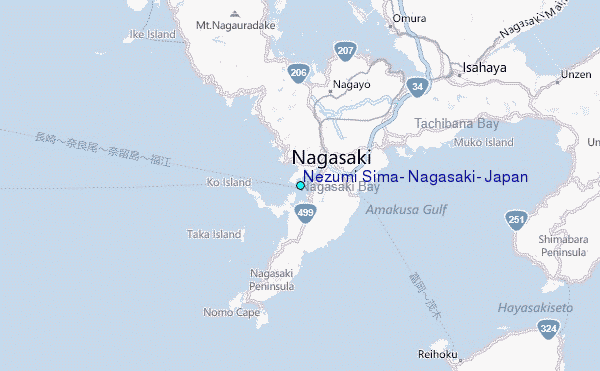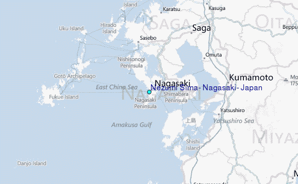 Use this relief map to navigate to tide stations, surf breaks and cities that are in the area of Nezumi Sima, Nagasaki, Japan.
