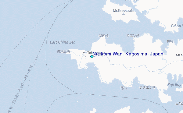 Use this relief map to navigate to tide stations, surf breaks and cities that are in the area of Nisikomi Wan, Kagosima, Japan.
