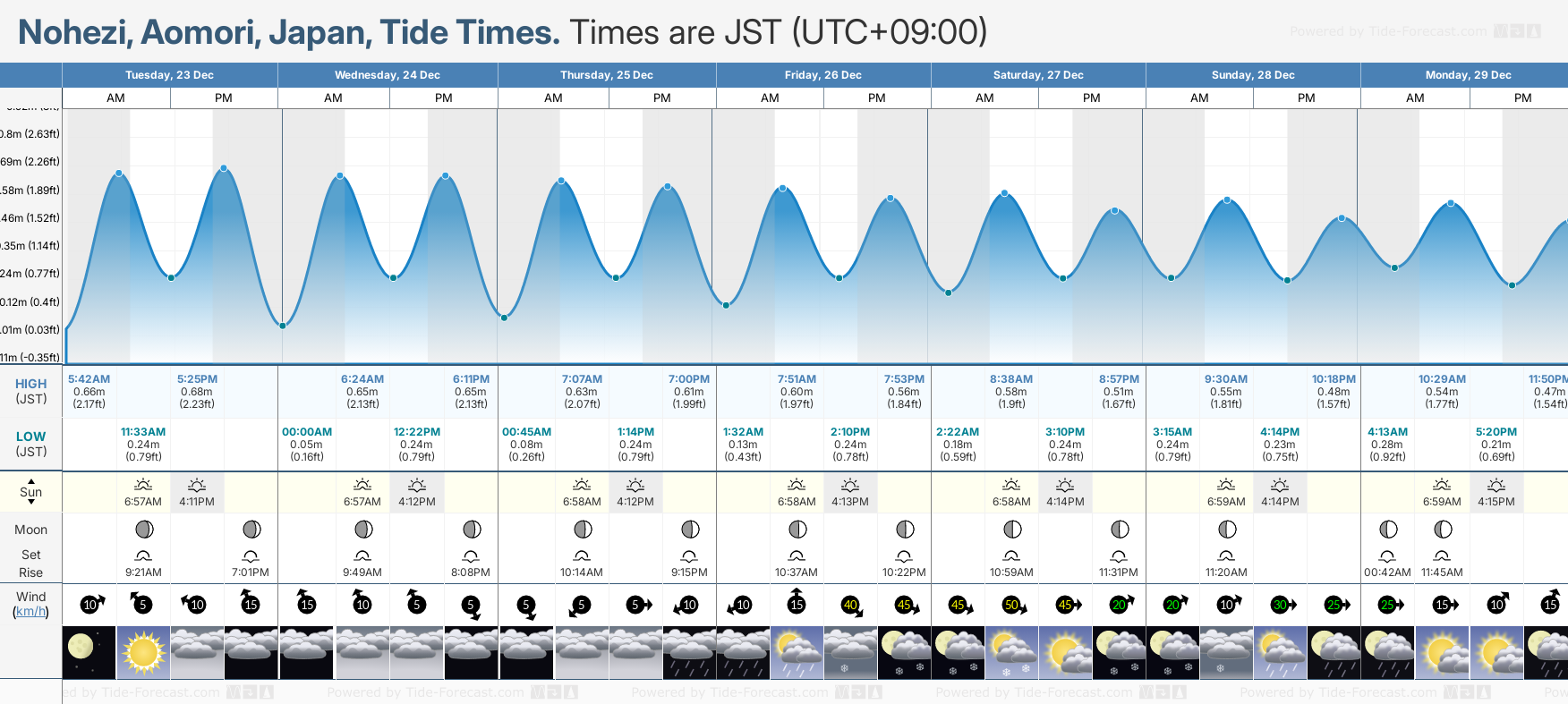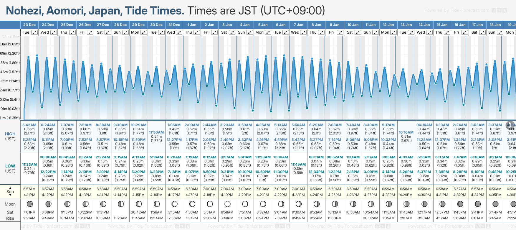 December and January Tide charts for Nohezi: The tide charts below show the height, time and date of high and low tides for the next 30 days.