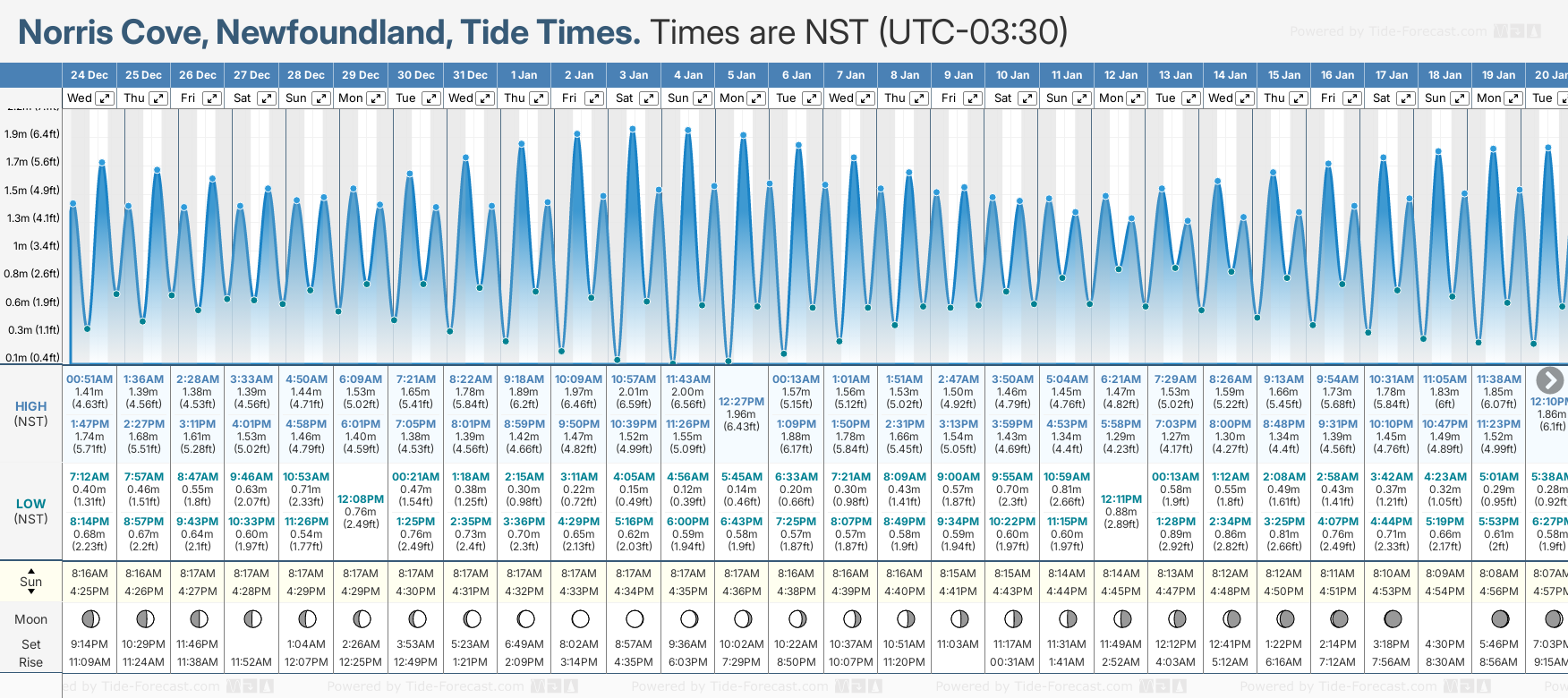Tide Times are NST (UTC -3.5hrs). Last Spring High Tide at Norris Cove was on Sun 21 Dec (height: 1.82m 6.0ft). Next high Spring Tide at Norris Cove will be on Sat 03 Jan (height: 2.01m 6.6ft).