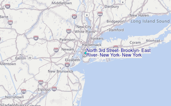 Use this relief map to navigate to tide stations, surf breaks and cities that are in the area of North 3rd Street, Brooklyn, East River, New York, New York.