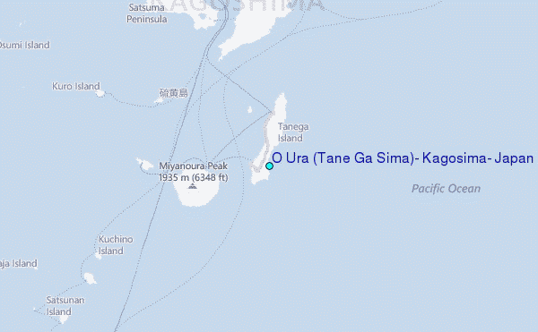Use this relief map to navigate to tide stations, surf breaks and cities that are in the area of O Ura (Tane Ga Sima), Kagosima, Japan.