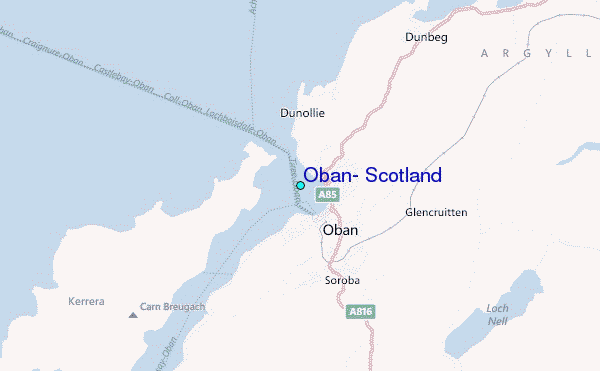 Use this relief map to navigate to tide stations, surf breaks and cities that are in the area of Oban, Scotland.