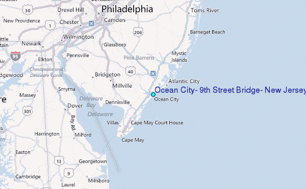 Use this relief map to navigate to tide stations, surf breaks and cities that are in the area of Ocean City, 9th Street Bridge, New Jersey.