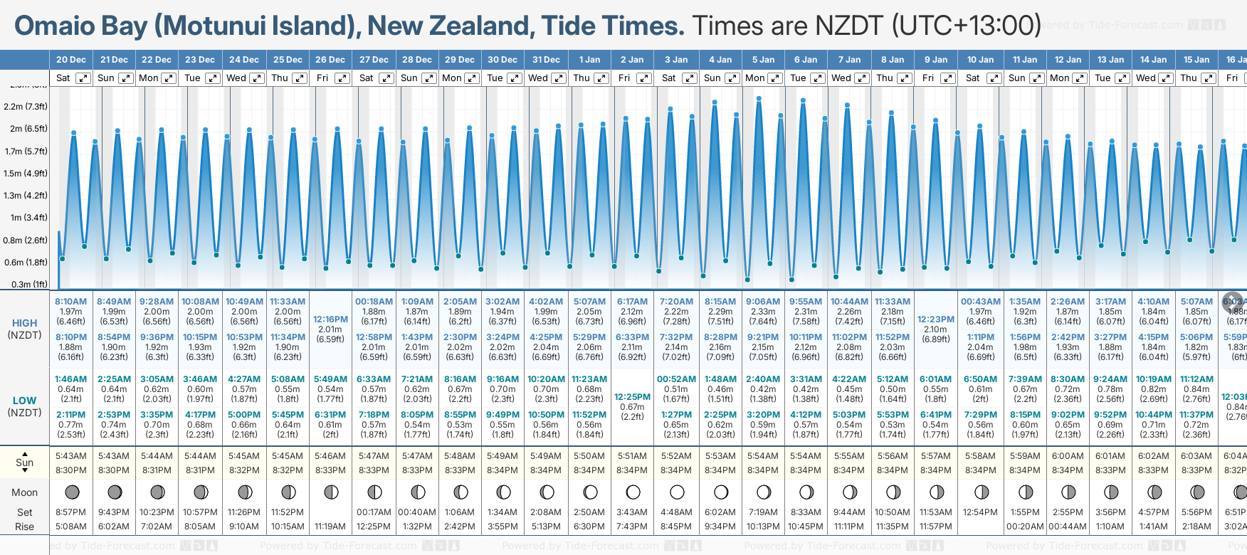 December and January Tide charts for Omaio Bay (Motunui Island): The tide charts below show the height, time and date of high and low tides for the next 30 days.