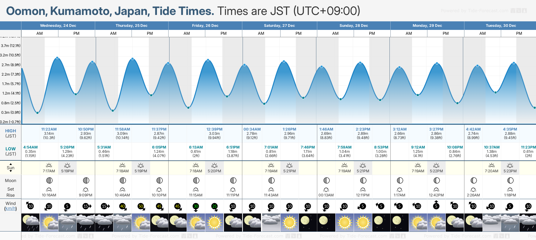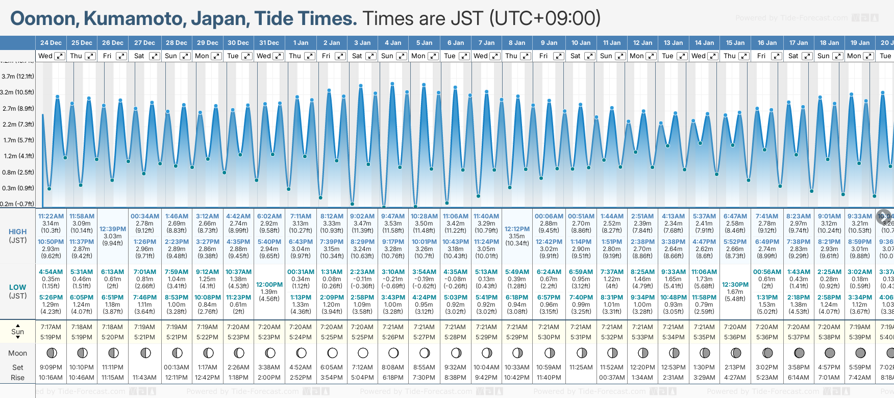Tide Times are JST (UTC +9.0hrs). Last Spring High Tide at Oomon was on Mon 22 Dec (height: 3.20m 10.5ft). Next high Spring Tide at Oomon will be on Sun 04 Jan (height: 3.53m 11.6ft).