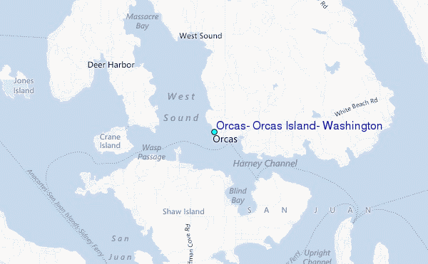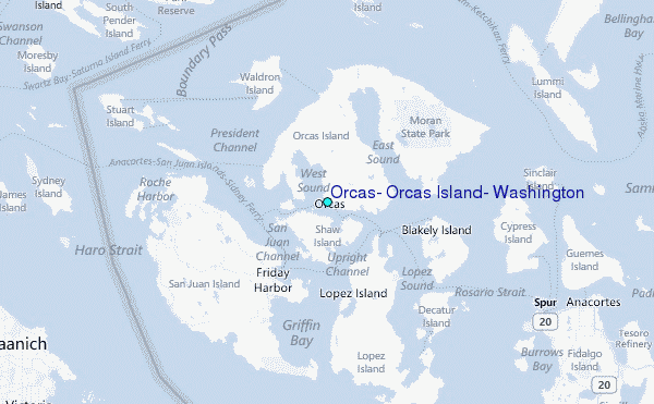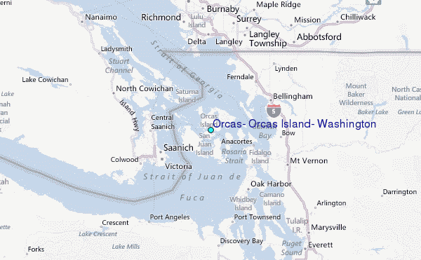 Use this relief map to navigate to tide stations, surf breaks and cities that are in the area of Orcas, Orcas Island, Washington.