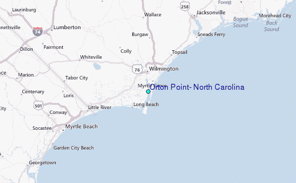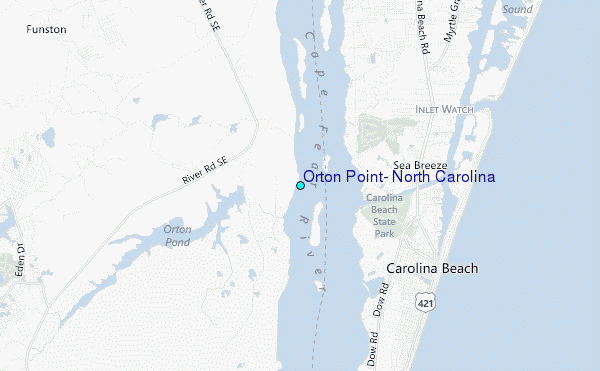 Use this relief map to navigate to tide stations, surf breaks and cities that are in the area of Orton Point, North Carolina.