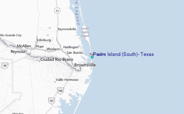 Use this relief map to navigate to tide stations, surf breaks and cities that are in the area of Padre Island (South), Texas.