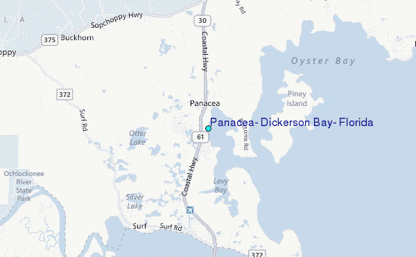 Use this relief map to navigate to tide stations, surf breaks and cities that are in the area of Panacea, Dickerson Bay, Florida.