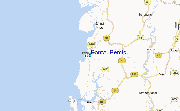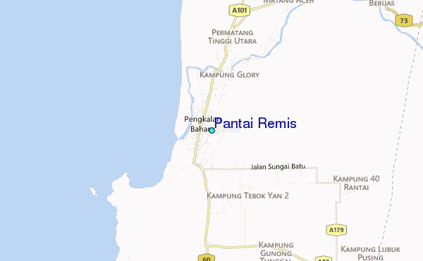 Use this relief map to navigate to tide stations, surf breaks and cities that are in the area of Pantai Remis.