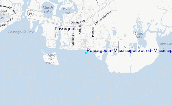 Use this relief map to navigate to tide stations, surf breaks and cities that are in the area of Pascagoula, Mississippi Sound, Mississippi.