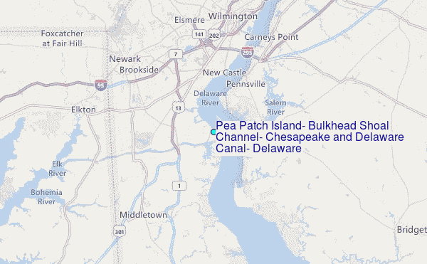 Use this relief map to navigate to tide stations, surf breaks and cities that are in the area of Pea Patch Island, Bulkhead Shoal Channel, Chesapeake and Delaware Canal, Delaware.
