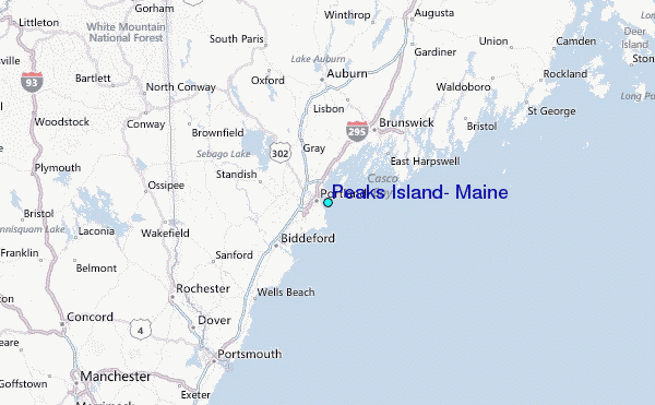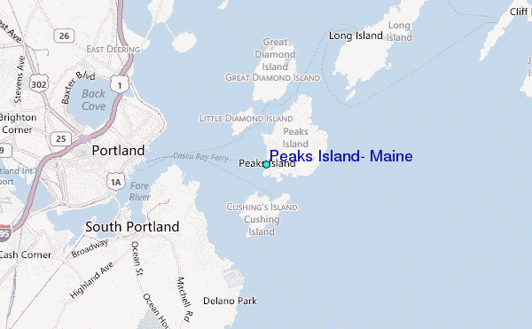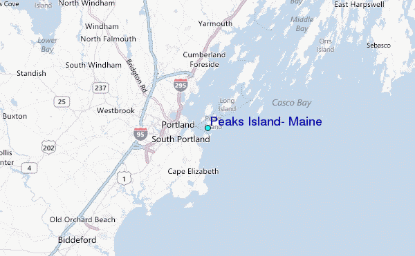 Use this relief map to navigate to tide stations, surf breaks and cities that are in the area of Peaks Island, Maine.