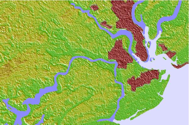 Use this relief map to navigate to tide stations, surf breaks and cities that are in the area of Pennys Creek, west entrance, Stono River, South Carolina.