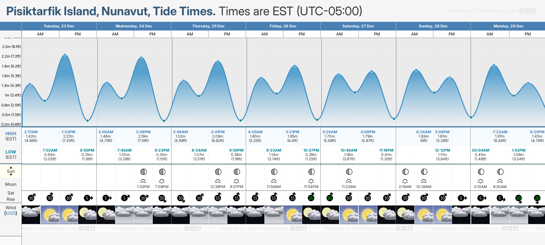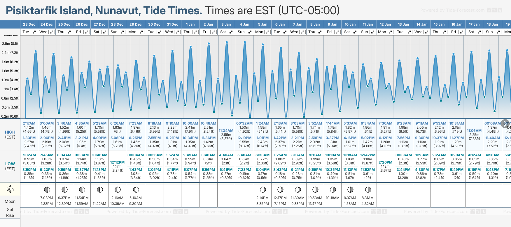 December and January Tide charts for Pisiktarfik Island: The tide charts below show the height, time and date of high and low tides for the next 30 days.
