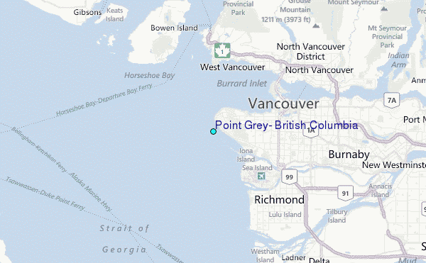 Use this relief map to navigate to tide stations, surf breaks and cities that are in the area of Point Grey, British Columbia.