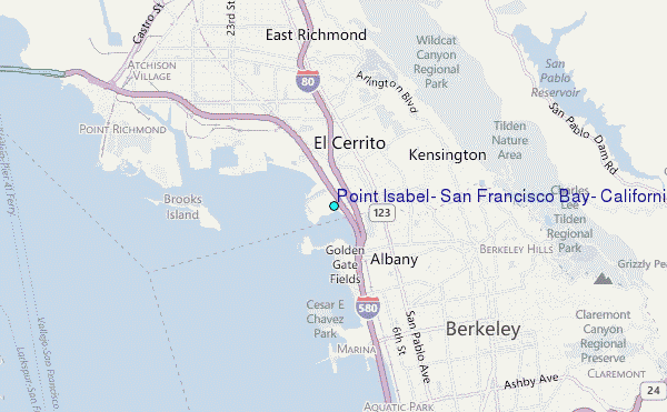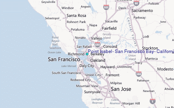 Use this relief map to navigate to tide stations, surf breaks and cities that are in the area of Point Isabel, San Francisco Bay, California.