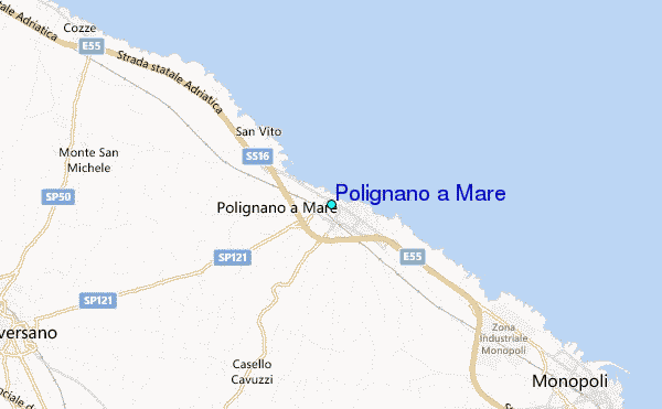 Use this relief map to navigate to tide stations, surf breaks and cities that are in the area of Polignano a Mare.