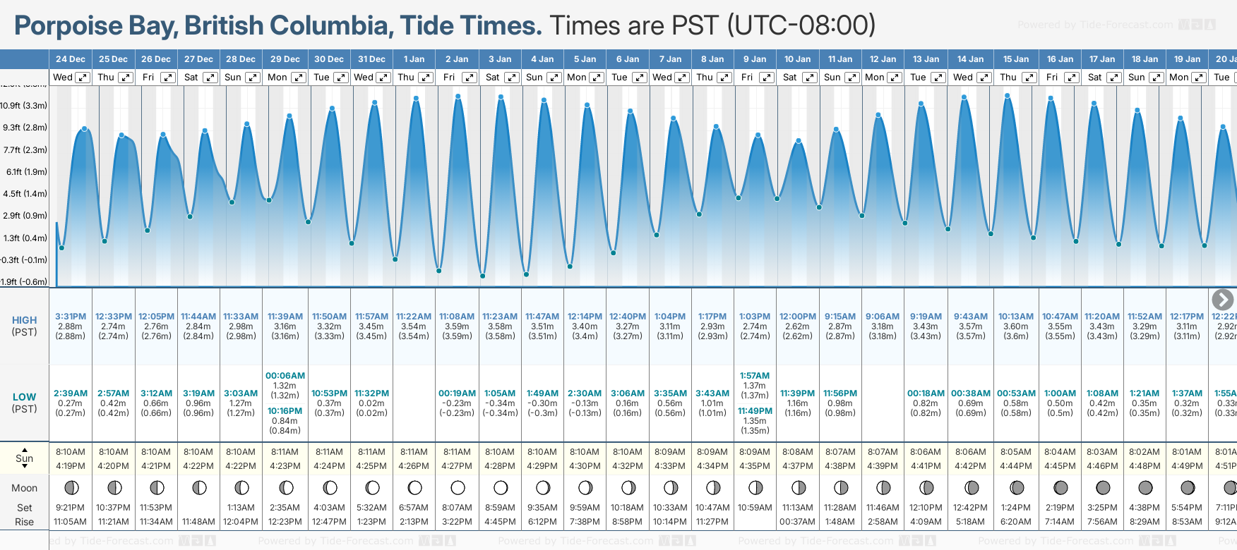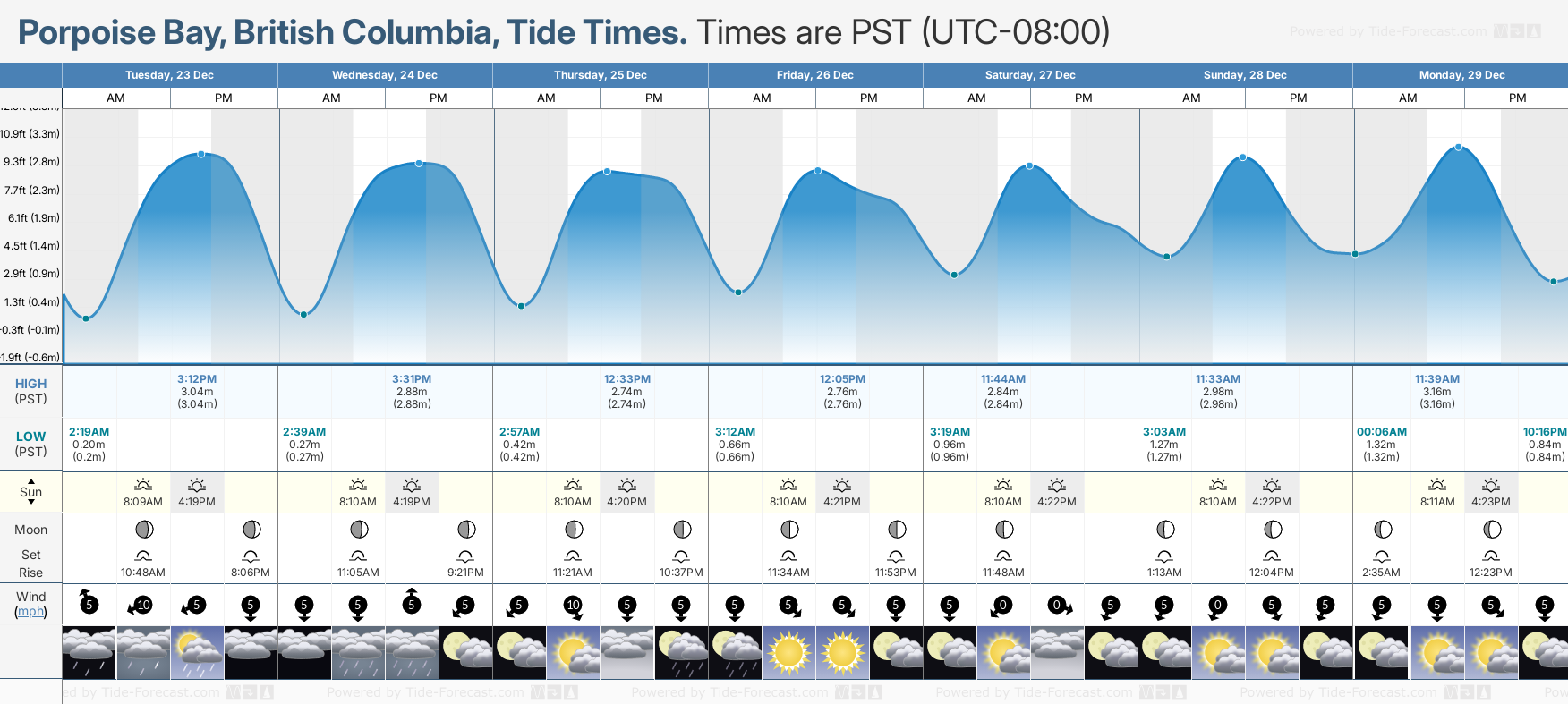 Tide chart for Porpoise BayShowing low and high tide times for the next 30 days at Porpoise Bay. Tide Times are PST (UTC -8.0hrs).